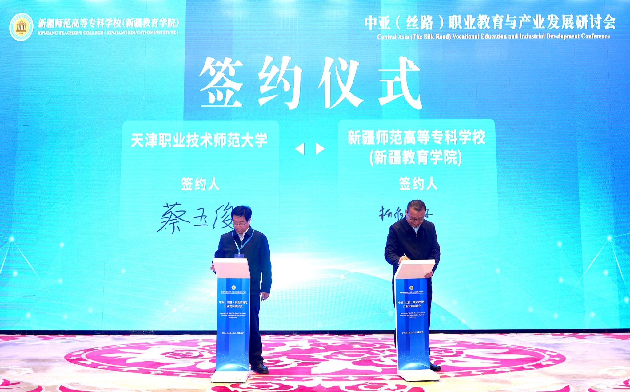 今日球盟会党委常委、副校少蔡玉俏授邀正在新疆黑鲁木全参与中亚(丝道)劳动教导取财产成长研究会,并代替黉舍取新疆师范初等专长黉舍(新疆教导教院)签定互助备记录。